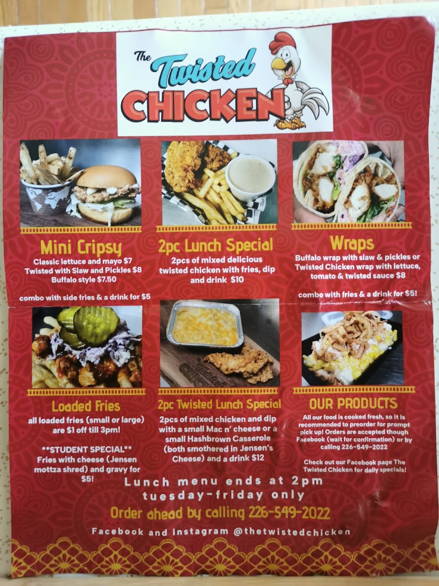 Welcome to The Twisted Chicken, a delightful culinary haven nestled in the heart of Delhi, Ontario. Located at 425 James St, this gem is quickly becoming a must-visit for chicken lovers and comfort food enthusiasts alike. With a phone number of +1 226-549-2022, you can easily reach out for inquiries or to place an order ahead of your visit.